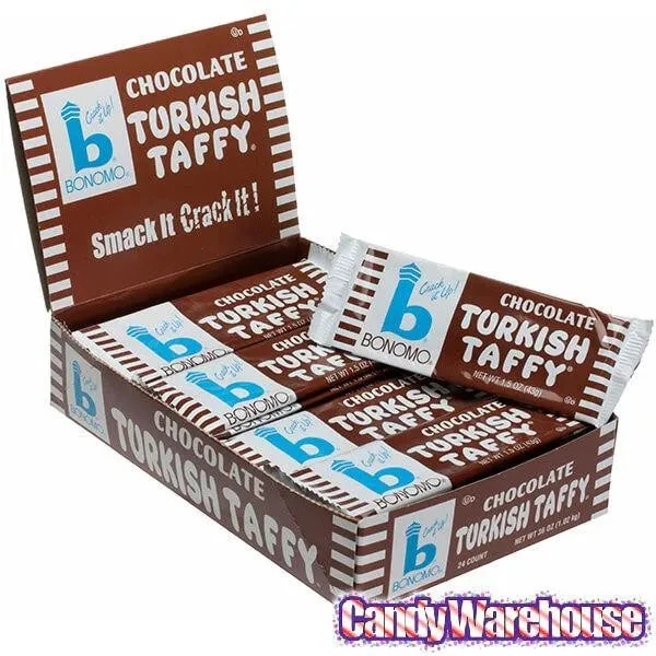 Display box contains 24 Bonomo Chocolate Turkish Taffy Candy Bars, each with a net weight of 1.5 ounces.