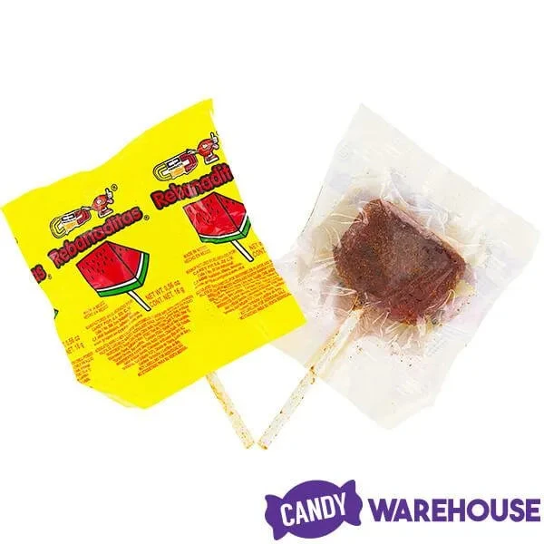 Watermelon hard candy suckers (paleta) are coated with chili pepper powder, creating a unique and delicious contrast of sweet and spicy flavors!